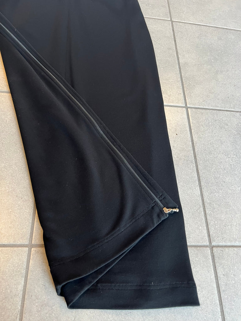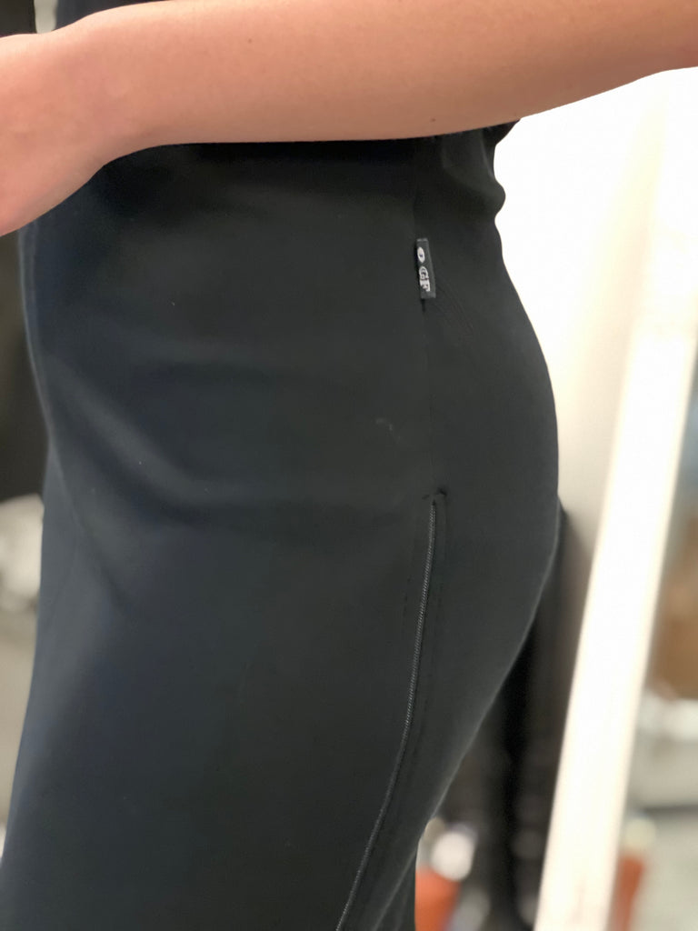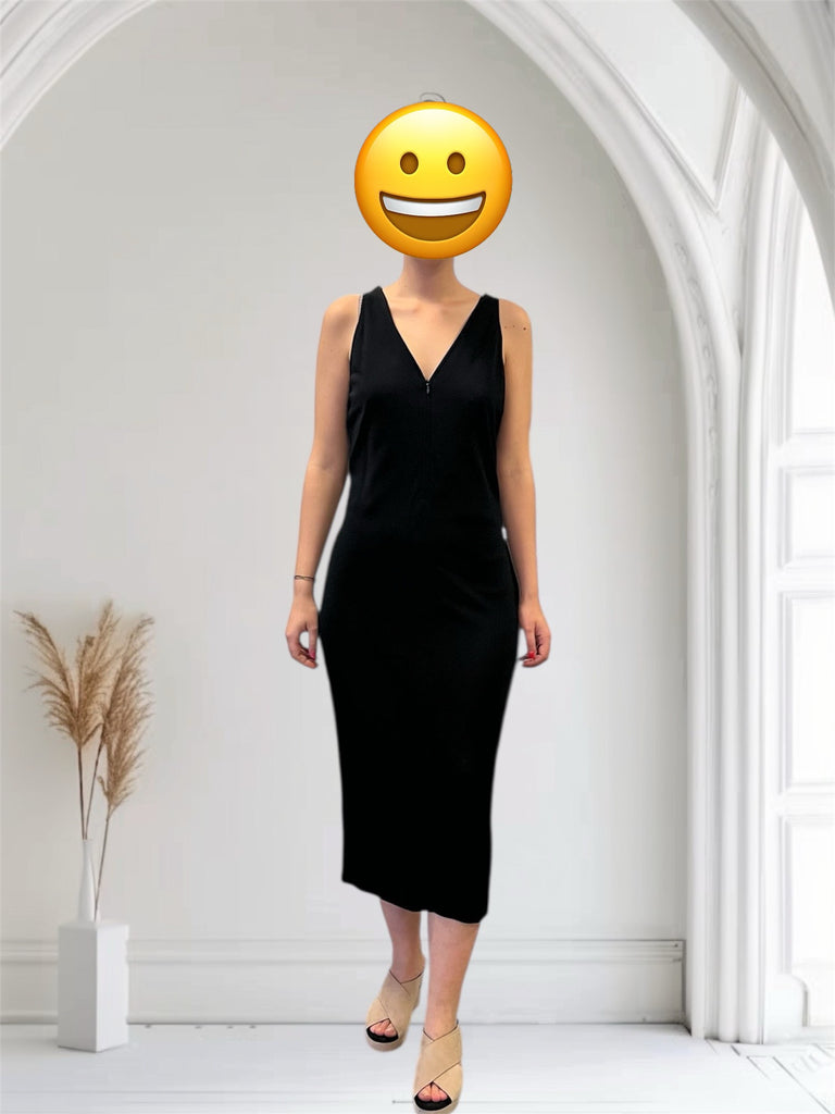 🔹Il design è semplice ed elegante, caratterizzato da uno scollo a V e una chiusura con zip frontale. La presenza di due zip laterali in basso suggerisce una possibile apertura per facilitare la vestibilità o creare uno spacco, conferendo una nota grintosa a un vestito apparentemente sobrio.