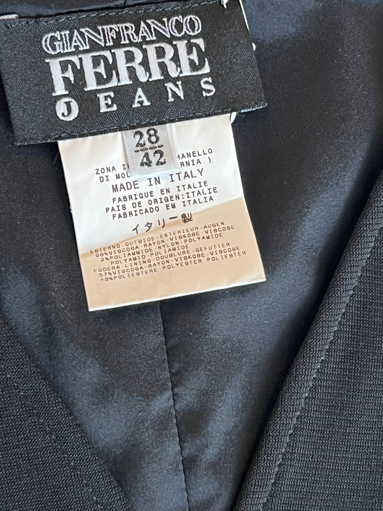 🔹Gianfranco Ferré è un marchio italiano di alta moda, famoso per la sua sartorialità impeccabile e l'eleganza sofisticata. La linea "Jeans" rappresenta una declinazione più casual e accessibile del brand, pur mantenendo l'attenzione al dettaglio e alla qualità dei materiali tipica di Ferré. Questo abito, quindi, coniuga la praticità di un capo versatile con l'eleganza discreta del marchio.