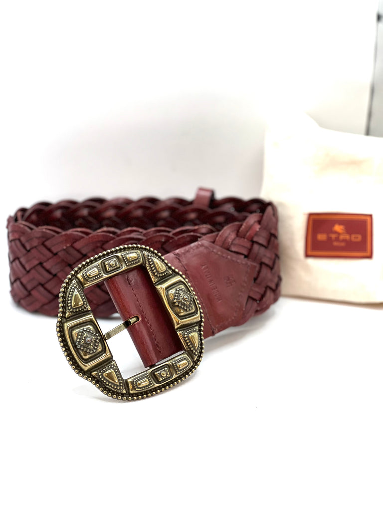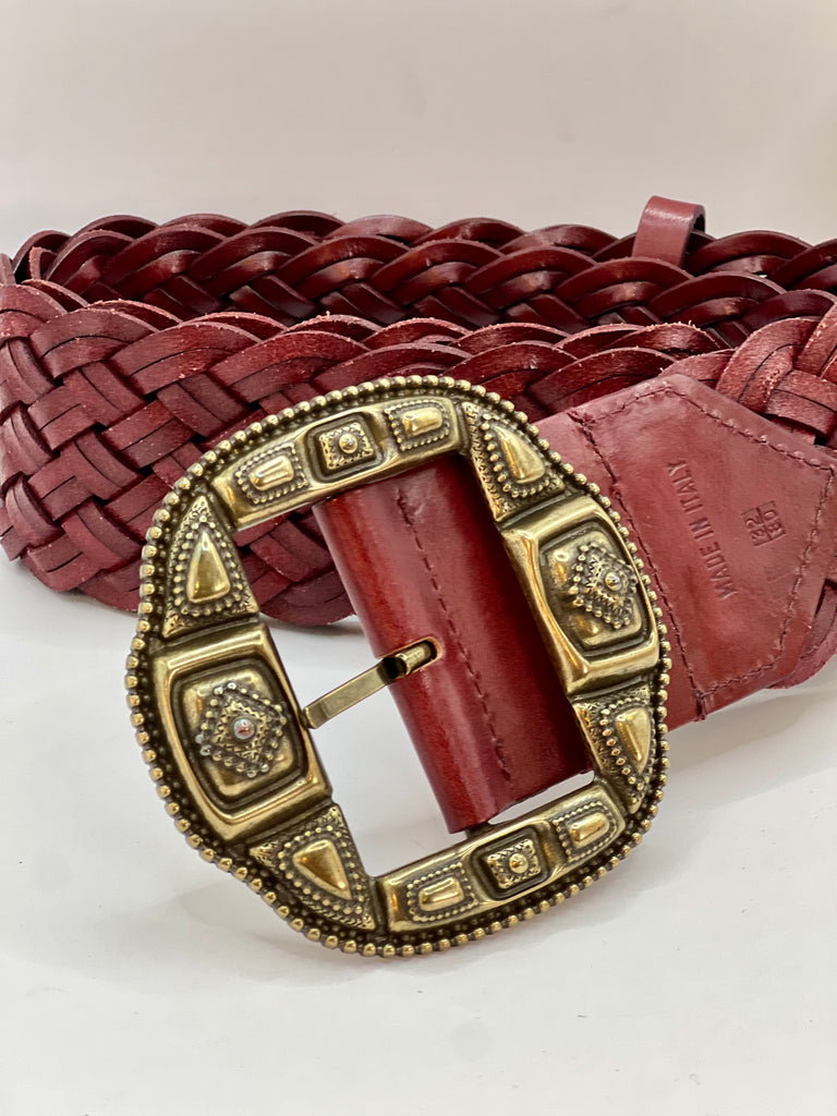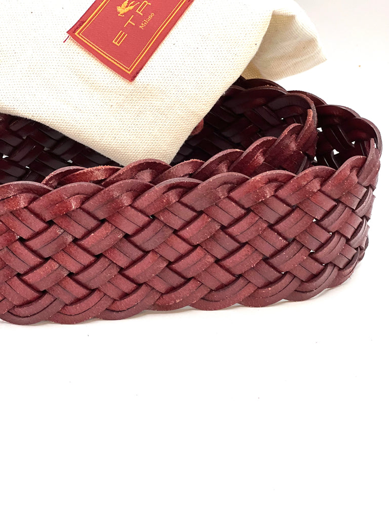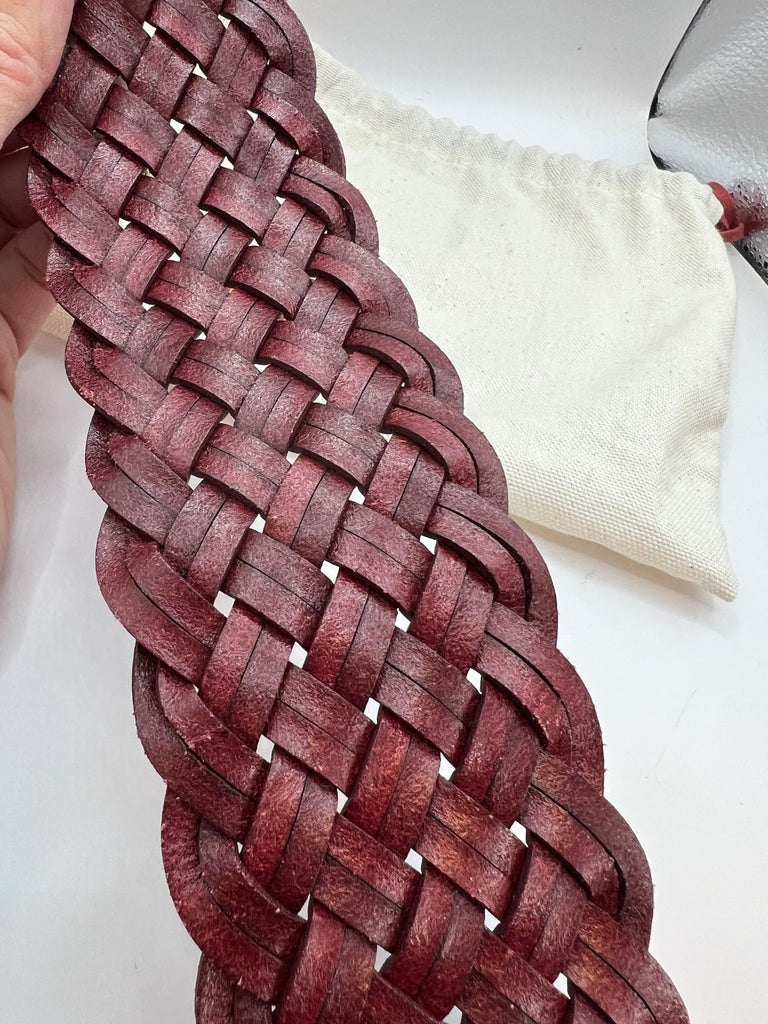 🔹 È realizzata con pregiata pelle intrecciata, in una ricca nuance bordeaux. La fibbia, dorata e leggermente brunita, è finemente decorata con motivi etnici e aggiunge un dettaglio prezioso. L'intreccio della pelle conferisce texture e profondità, mentre il colore bordeaux e la fibbia dorata evocano un'eleganza casual e insieme sofisticata.