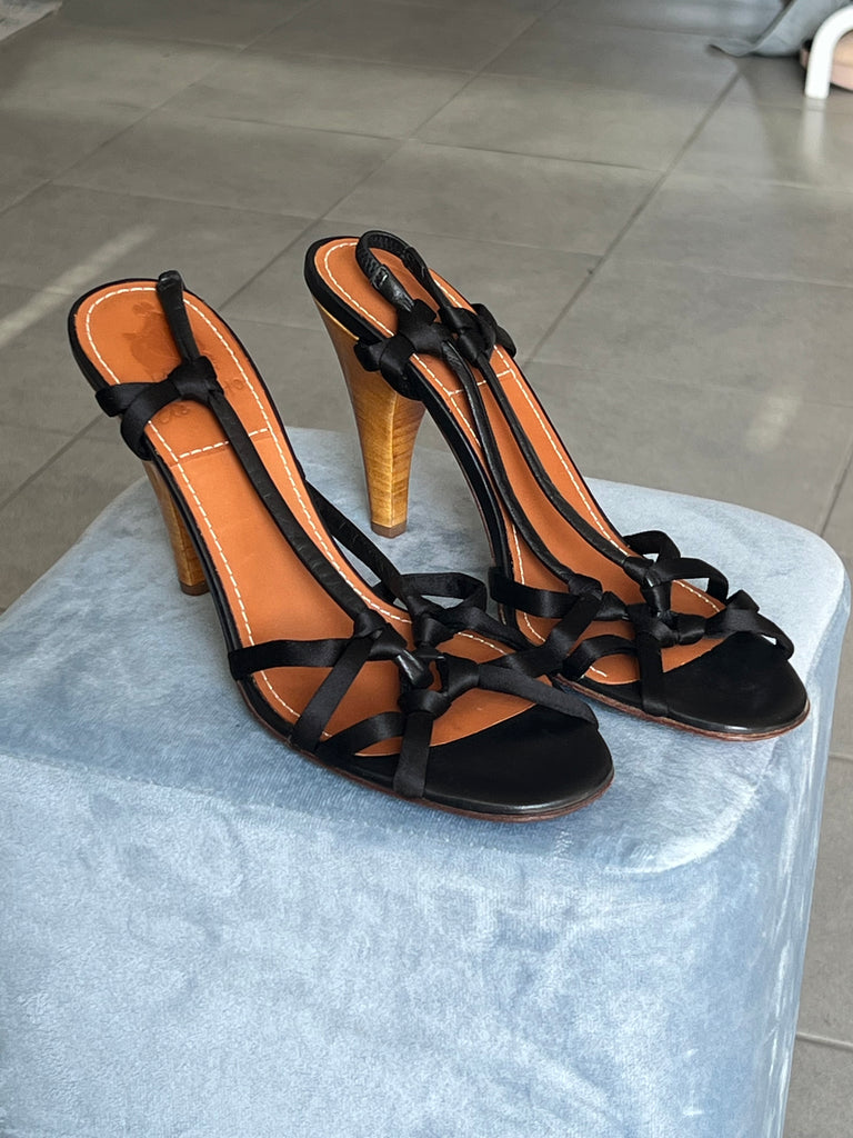 🔹 Il modello slingback ha tacco in legno e soletta in pelle color cuoio; un raffinato disegno di fettuccia nera in tessuto e piccoli nodi completa un sandalo dalla squisita eleganza.