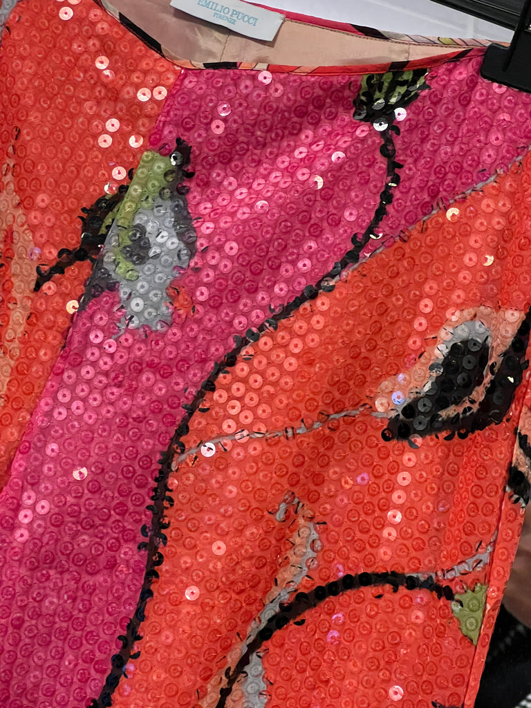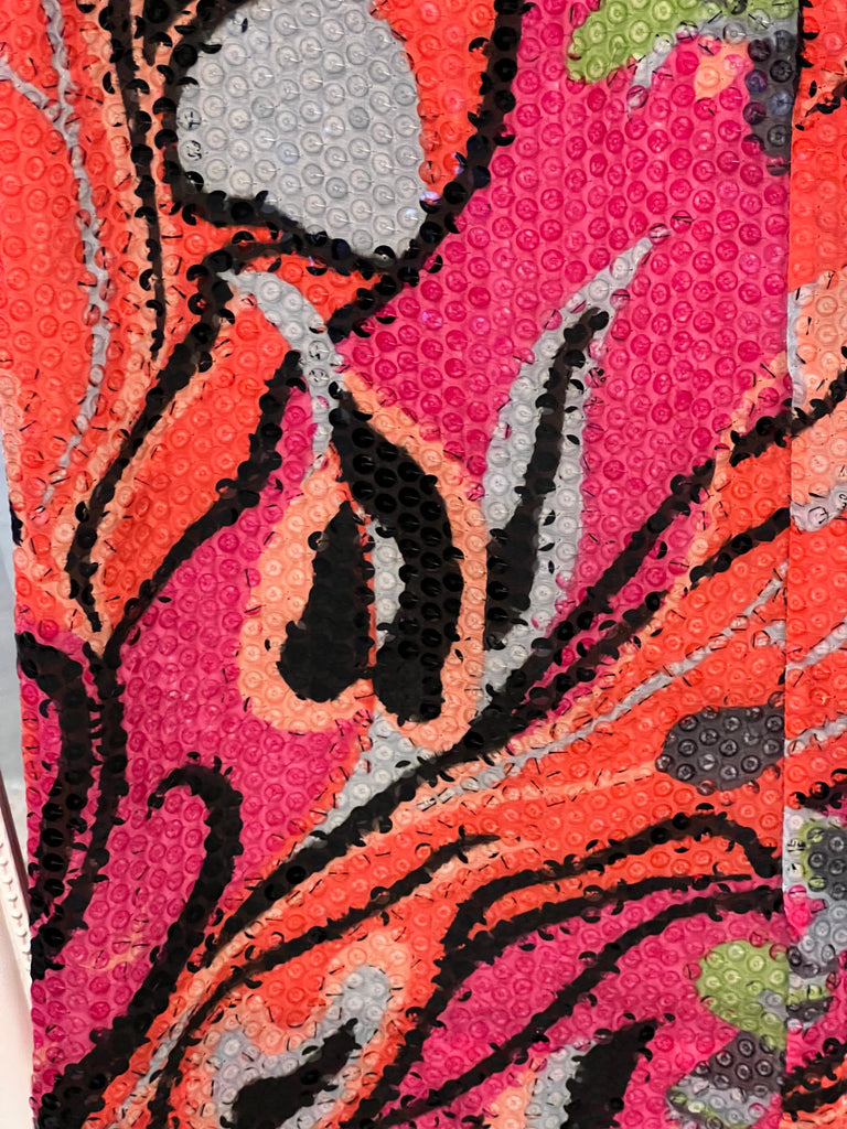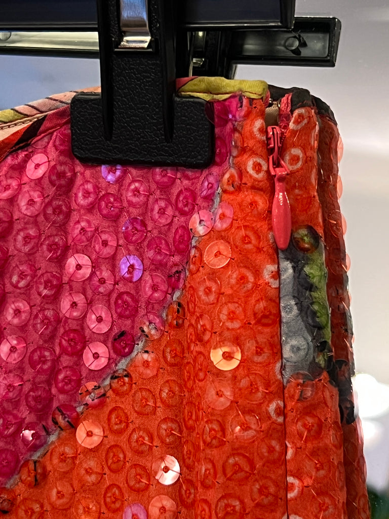 🔹 Il modello a palazzo ha zip laterale ed è interamente foderato. Bellissima la fantasia floreale stilizzata, sui toni dell’arancio e del rosa. Il tessuto leggero è completamente ricoperto di paillettes che riflettono la luce ad ogni movimento.